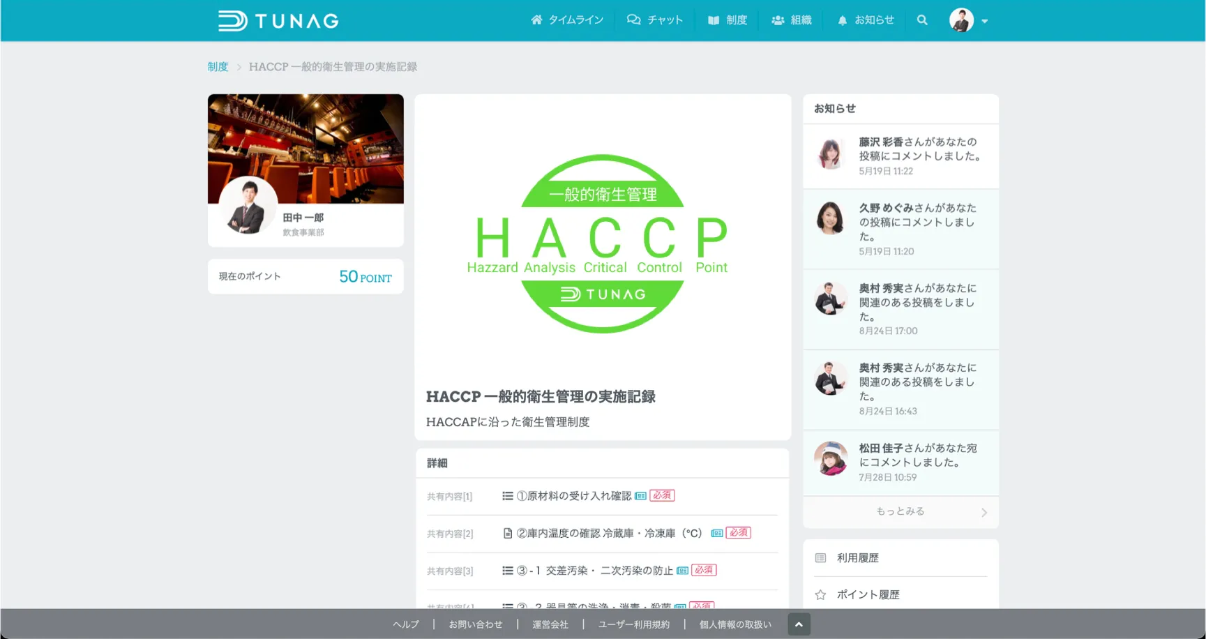 日常として社内のワークフローや店舗情報共有及び、日報などをベースにコミュニケーションプラットフォームとしてTUNAGを利用しているため、衛生管理についても同様に、社員が一番使いやすい運用を意識して今回のHACCPのスター トにともないご相談、ご協力いただきました。出来るだけ、本部の管理都合で社員の利用ツールが増え、現場の負担を増えることがないように日々工夫して改善し続けております。