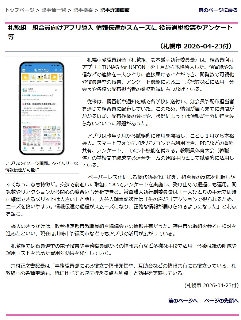 タイトル:札教組 組合員向けアプリ導入 情報伝達がスムーズに 役員選挙投票やアンケート等